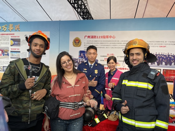 Additionally, they visited the booth of the Guangzhou Fire Department's 119 Command Center to learn about fire safety knowledge. Under the guidance of firefighters, they tried out backpack-type spray fire extinguishers and wore fire rescue suits.