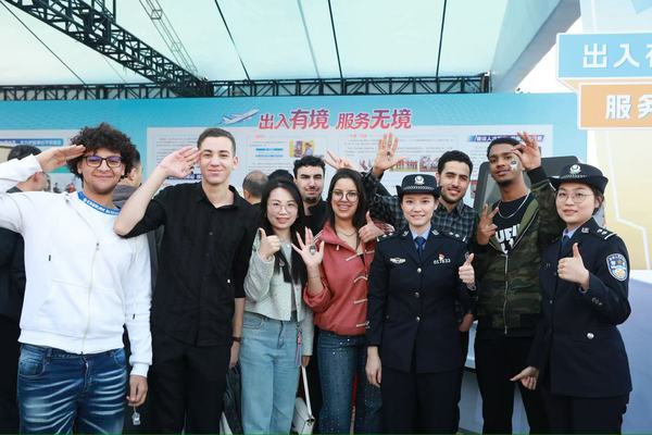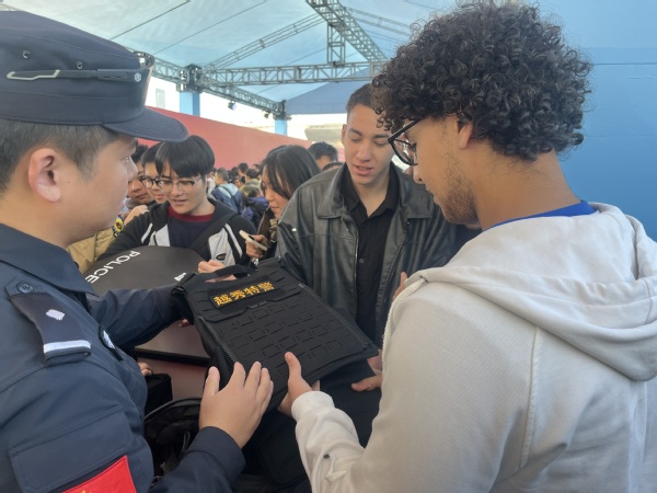 During the event, under the guidance of Ms. Emma Shi, the international students visited the public security equipment exhibition area. Police officers provided detailed explanations of the functions and application scenarios of the equipment. In addition, students observed practical demonstrations, and even tried on some of the equipment. After that, they experienced the digital services offered by the Exit-Entry Administration Brigade and attended knowledge lectures delivered by police officers on various topics, including anti-scam, online fraud, economic crime investigation, and counterfeit product identification.